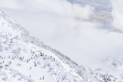 Fluffy snow capped mountains blend into the dreamy skies in TOP OF HEAVENLY, LAKE TAHOE, from Gray’s popular À la Montagne series.