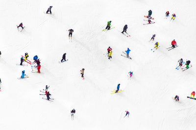 A mesmerizing moment captures brightly colored skiers sprinkled through the Canadian slopes in TOP OF WHISTLER HORIZONTAL. Gray's global A la Montagne series, shot from a doorless helicopter, presents the luxe opulence found in lavish ski resorts. Gray highlights how every day objects appear to form repetitious patterns with his visual celebration of wintertime bliss.