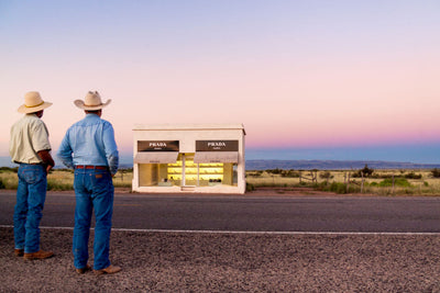 Challenge the ordinary with “Two Cowboys, Prada Marfa,” a thought-provoking fine art photography print from Gray Malin’s “Prada Marfa” series. This piece contrasts two rural cowboys against a luxury boutique in Marfa, creating an unexpected and iconic scene. Perfect for those who appreciate art that makes a statement.