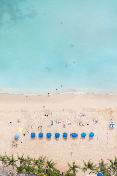 Dive right into this inviting tropical scene with beach umbrellas and warm turquoise waters. From the stunning A la Plage series, WAIKIKI BLUE UMBRELLAS captures the essence of summertime bliss from above.