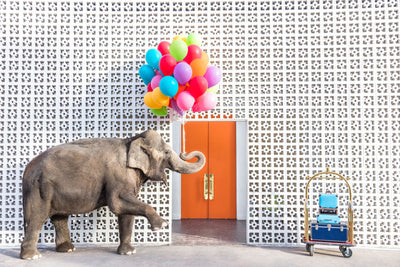 Arrive in style with “You’re Always Welcome at the Parker,” a vibrant fine art photography print with an elephant and balloons from Gray Malin’s “Gray Malin at the Parker” series. This piece captures the whimsical and colorful ambiance of the desert oasis, offering a warm invitation to the iconic Parker Hotel. Ideal for those who love a blend of modern luxury and retro charm, this print adds a bold statement to any space.